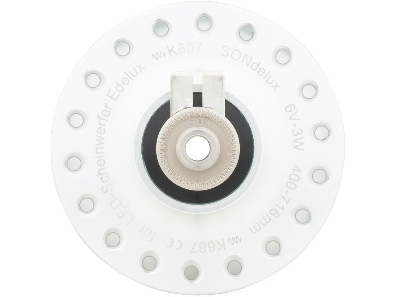 Spezifikationen:Elektrische Leistung:6V/3W (nach StVZO)Wirkungsgrad:65 % bei 15 km/h im 28″ -RadLeistungsaufnahme im Leerlauf:0,4 W bei 15 km/h im 28″ -RadEinbaubreite:9 x 100 mm SchnellspannerLochzahl:20 Loch, 24 Loch, 28 Loch, 32 Loch 36 LochBremssystem:FelgenbremseTechnische Daten:Serie:Son DeluxEinsatzbereich:Touring & Trekking, CityMaterial Nabenkörper:Aluminium (6082-T6)Lagerung:Rillenkugellager 629-2RSH (SKF)Dichtung:Spaltdichtung, Dichtscheiben und DruckausgleichsystemFlanschabstand (L/R):50 mm (25 mm/25 mm)Teilkreisdurchmesser (L/R):54 mm/54 mmSpeichenlochdurchmesser:2 mmAnschluss für Stromausgang:4,8 mm Flachstecker, 2-polig, massefreiFreigaben:Zulassung im Straßenverkehr:Ja, in Verbindung mit LED-Lampen (SON Edelux / Edelux II)Prüfziffer:K~~687Kompatibilität:für 16″ bis 28″ Räder (400-716 mm)für 3 mm KoaxialkabelFeatures:Neodym-Eisen-Bor Magnetrotor, 26-poligHohlachse (10 mm) aus Aluminium 7075-T6Achsenden aus rostfreiem StahlHerstellernummern:poliert 20 Loch:262002schwarz 20 Loch:262012poliert 24 Loch:262402schwarz 24 Loch:262412poliert 28 Loch:262802schwarz 28 Loch:262812poliert 32 Loch:263202schwarz 32 Loch:263212silber-eloxiert 32 Loch:263292rot 32 Loch:263222poliert 36 Loch:263602schwarz 36 Loch:263612silber-eloxiert 36 Loch:263692rot 36 Loch:263622Lieferumfang:1 x Nabendynamo SON Son Delux1 x Spannachse (Innensechskant)